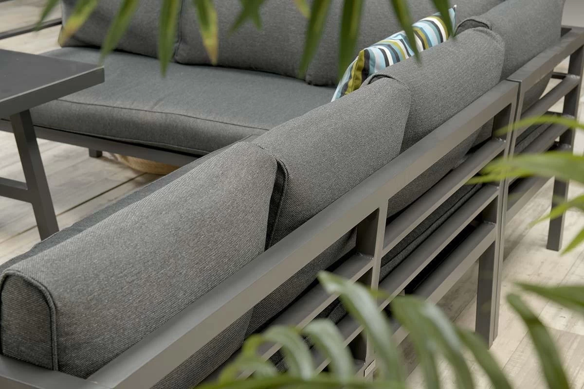 De meegeleverde kussens zijn gemaakt van hoogwaardig kwaliteit polyester. De zwartkleurige kussens zijn voorzien van een rits waardoor de hoezen gemakkelijk met de hand kunnen worden gewassen. De kussens zijn niet waterbestendig en kunnen na gebruik worden opgeborgen in de schuur of in een kussenbox. De ruime tafel is vervaardigd uit aluminium met een geharde glasplaat.