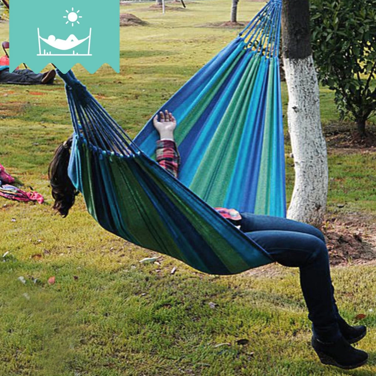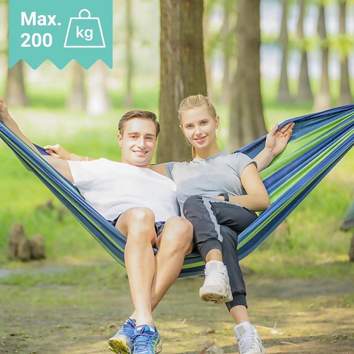 Dubbele Hangmat voor 1 of 2 personen van het merk HomeShopXL Heerlijk vertoeven in eigen tuin! In deze hangmat kom je (samen) tot rust! Bevestig hem tussen 2 bomen, 2 palen of op een hangmatstandaard. De hangmat zit in een handige opbergtas waar ook de bevestigingstouwen in meegeleverd worden. Het is niet nodig om bij elke regenbui de hangmat weg te halen. Hij is weerbestendig zodat u hem gerust kunt laten hangen.