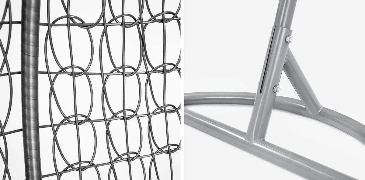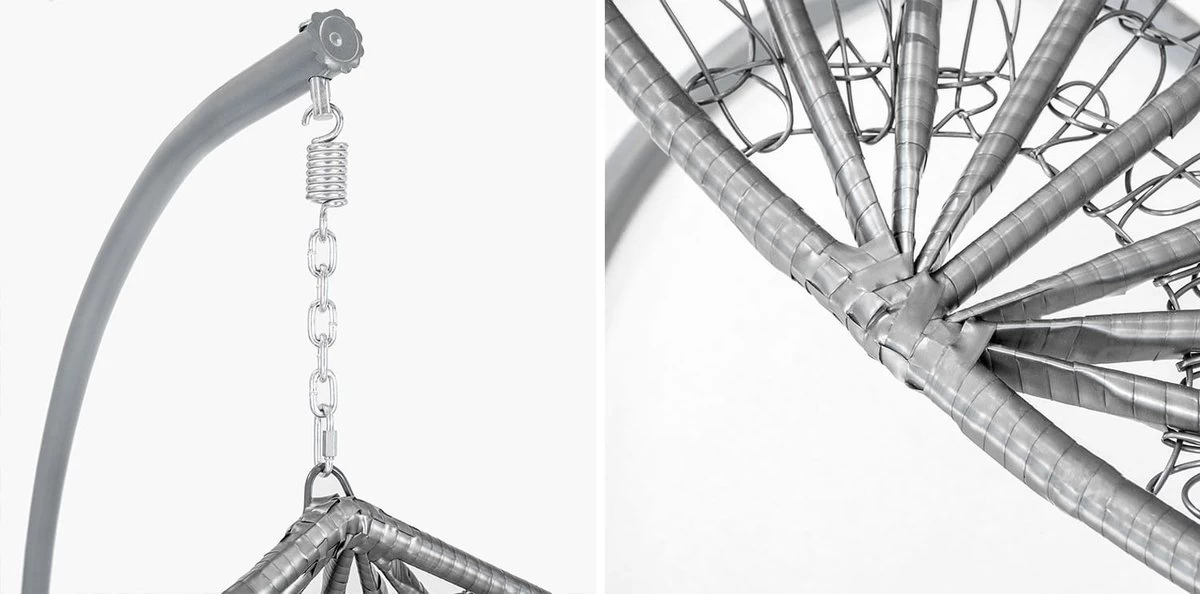 De grijze schommelstoel wordt met een veerhaak en een sterke ketting aan de standaard bevestigd, zodat je de cocoon stoel overal naartoe kunt verplaatsen. De hangstoel kan ook direct aan het plafond worden gemonteerd na aanschaf van de juiste montagekit. De ei stoel is gemaakt van staal en PVC en is bestand tegen allerlei weersomstandigheden zoals bijvoorbeeld UV-stralen,sneeuw en regen, je kan hem dus buiten gebruiken in ieder seizoen.