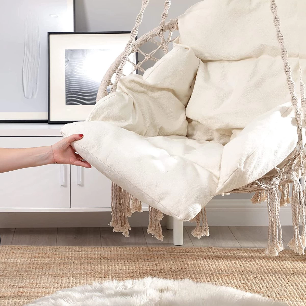 - Mooi behaaglijk: de hangstoel is uitgerust met een groot pluizig kussen, zodat je rug, armen en benen comfortabel worden ondersteund. Knuffel jezelf gezellig in en lees je favoriete boek