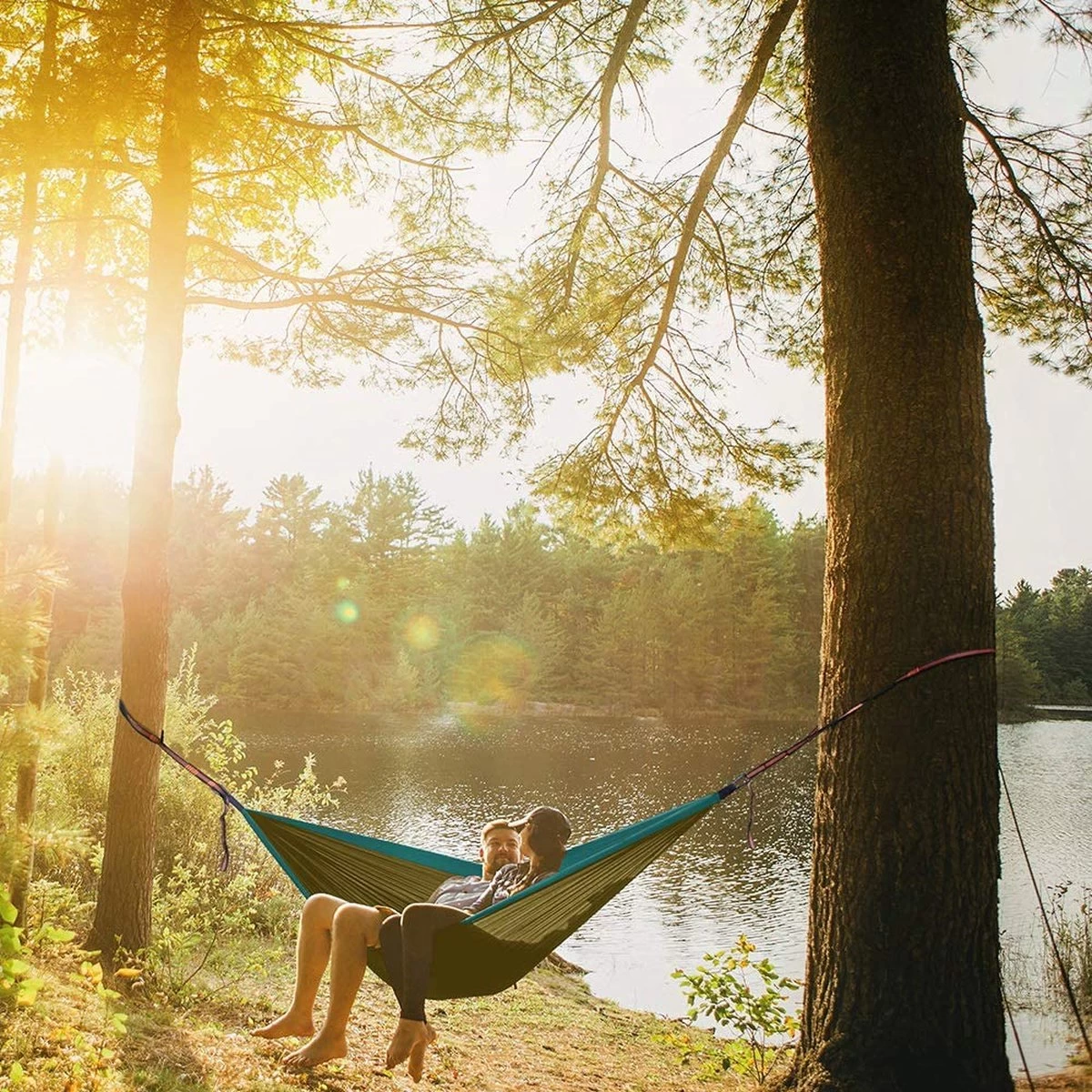 - Betrouwbaar parachute nylon: deze hangmat is gemaakt van parachute nylon. Deze stof staat bekend als extra licht, zacht voor je huid, grote scheurweerstand en weinig (opberg)omvang. Tegelijkertijd is het sterk en betrouwbaar en ziet het er stoer en solide uit. Bovendien droogt de stof snel, ideaal na een duik in het water, een regenbui of bij een laagje ochtenddauw.