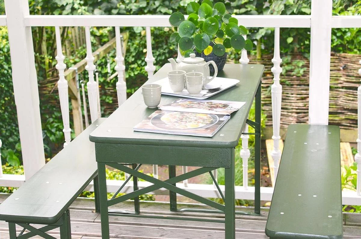 Inklapbare biertafels zijn geproduceerd voor binnen. De bladen zijn gemaakt uit verlijmd hout zodat de tafels eenvoudig zijn schoon te maken. Geverfde verlijmde producten zijn echter niet bestand tegen buiten gebruik, de bladen kunnen dan gaan scheuren. Hierop verlenen we dan ook geen garantie. Zoek je een inklapbare tafel die je wel buiten kunt gebruiken? Kijk dan eens naar onze inklapbare Hamburg en Riga tafels.