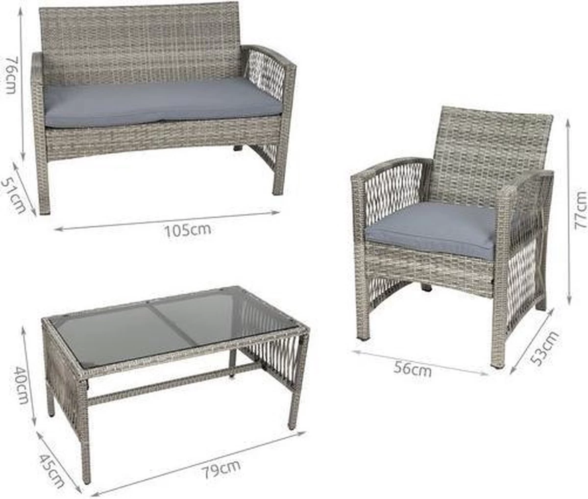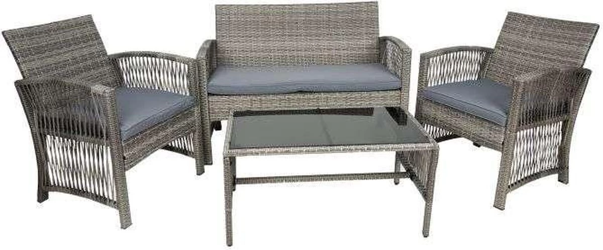 Bij langere opslag buiten raden we aan om de meubelen goed af te dekken om beschadiging en verkleuring te voorkomen. Bescherm kussenslopen tegen de regen. Let op: Deco-elementen zijn niet inbegrepen in de set.