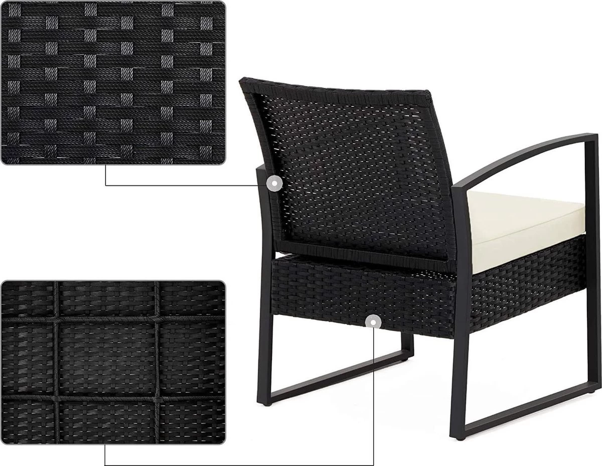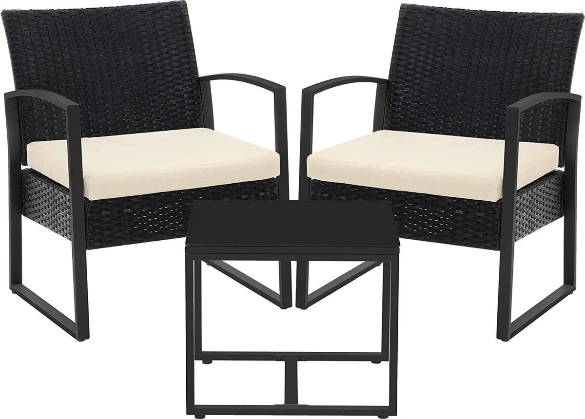 - Tuinmeubelset, 3-delige set, van polyrotan, voor outdoor, terras, balkon, tuin, eenvoudige montage, bijzettafel en 2 stoelen, zwart-beige