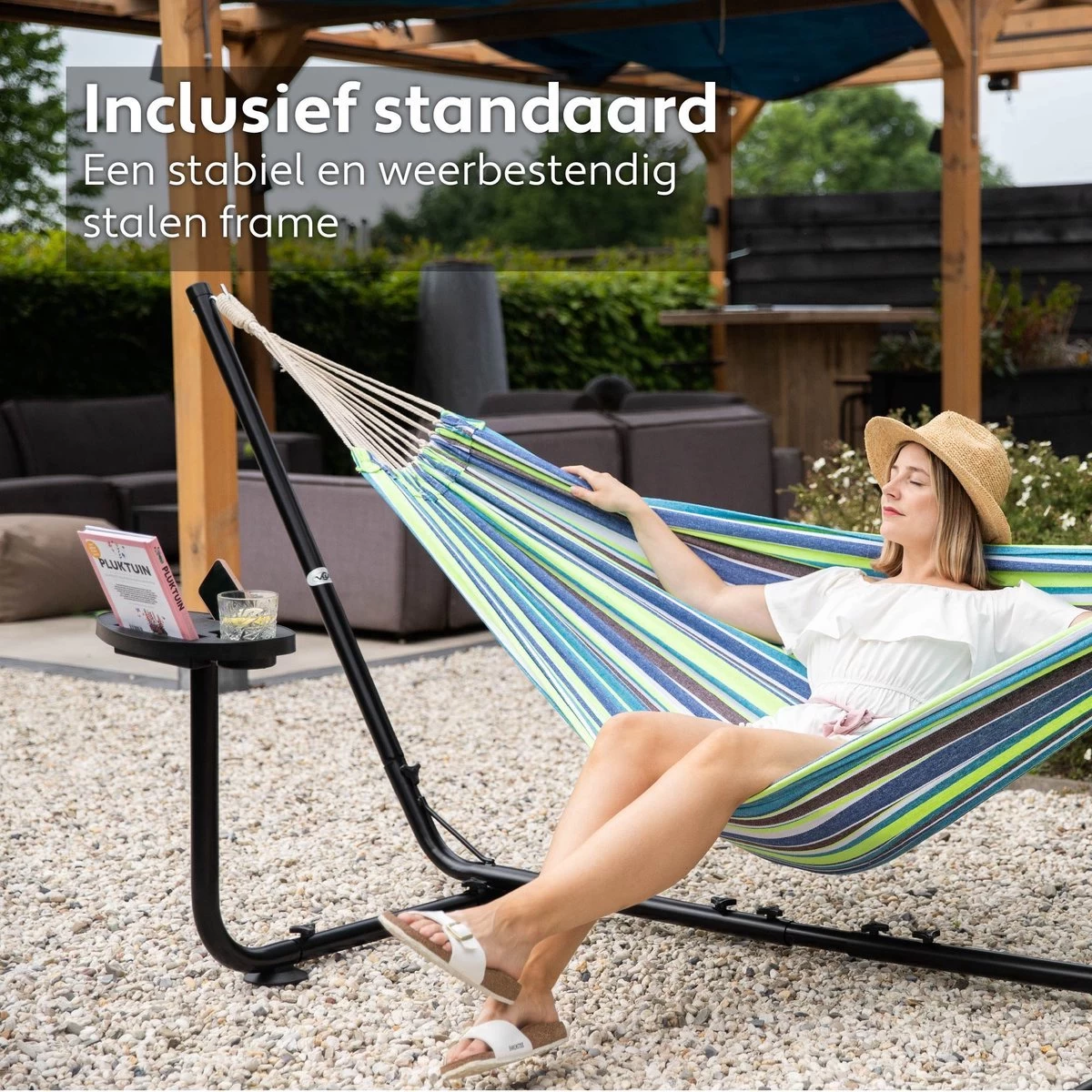 Vita5 Hangmat Met Standaard – 2 Persoons – Incl. Bekerhouder – 205kg Draaggewicht – Groen/Blauw
